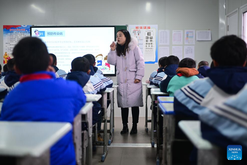 Students have a class in a prefabricated classroom in Guanting Town, Minhe Hui and Tu Autonomous County, northwest China's Qinghai Province, March 1, 2024. So far, all middle schools and primary schools in Qinghai Province affected by a 6.2-magnitude earthquake that struck neighboring Gansu Province on Dec. 18, 2023 have started the new semester.