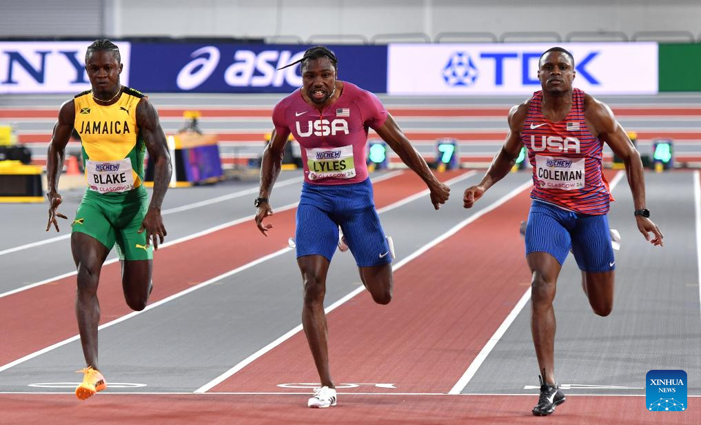 Christian Coleman (R), Noah Lyles (C) of the United States and Ackeem Blake of Jamaica compete during the men's 60m final of the 2024 World Athletics Indoor Championships in Glasgow, Britain, March 1, 2024. (Photo by Mark Runnacles/Xinhua)