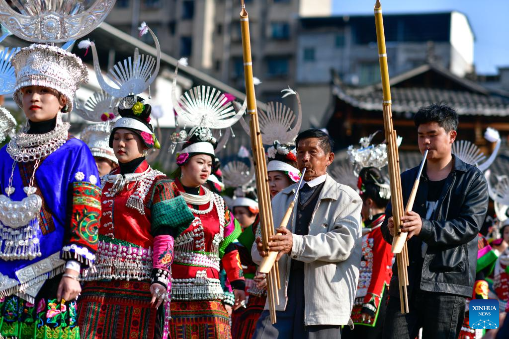 In Kaili, local ethnic Miao people have the custom of donning their traditional attire and performing Lusheng, a traditional musical instrument, to rejoice in the annual Gannangxiang festival, a time-honored celebration in Guizhou Province.