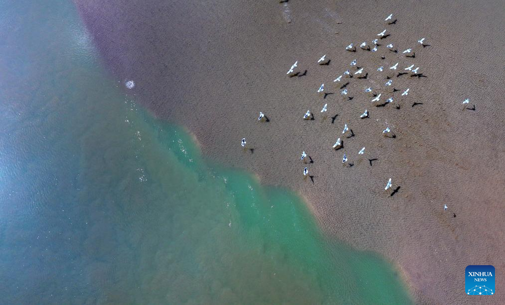 An aerial drone photo taken on March 1, 2024 shows migratory birds flying over the tidal-flat area at a section of the Yellow River in northwest China's Ningxia Hui Autonomous Region. With the temperature rising, the ice in Ningxia section of the Yellow River has been gradually melting. Flocks of migratory birds fly over the tidal-flat area and the turquoise water, adding a touch of vitality to the spring scenery. (Xinhua/Wang Peng)