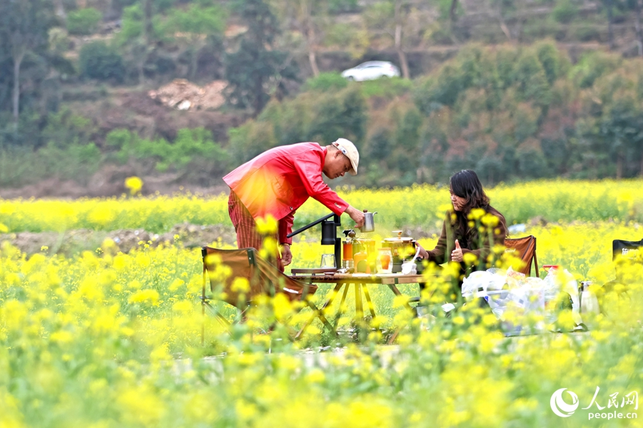 Tourists make coffee at a rapeseed field in Shanchong village, Changtai district, Zhangzhou city, southeast China's Fujian Province. (People's Daily Online/Li Changqian)