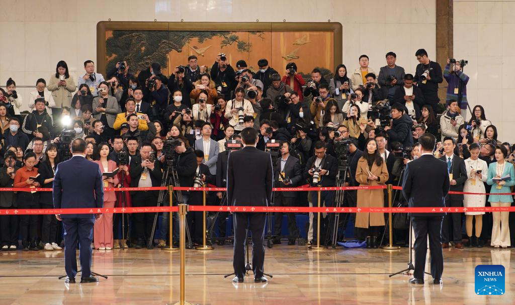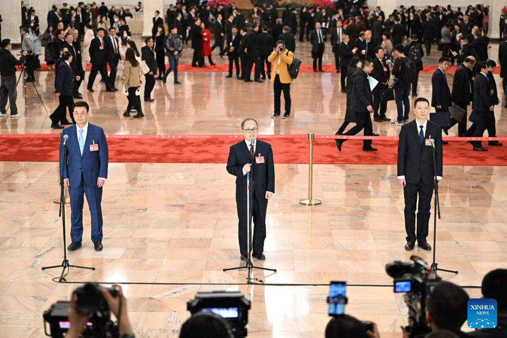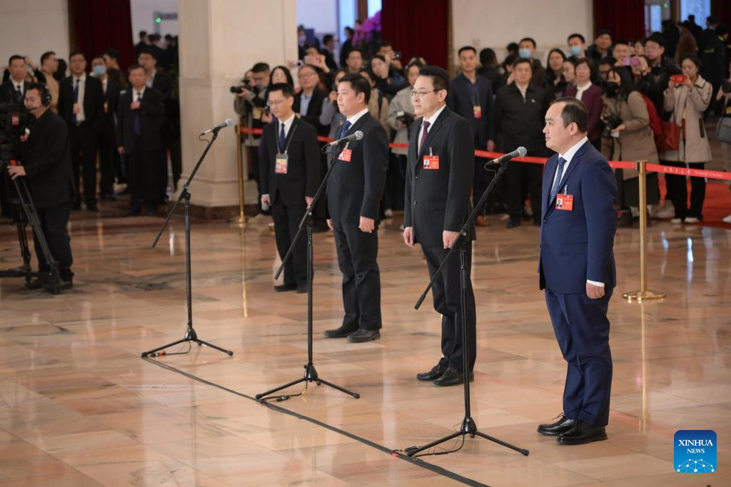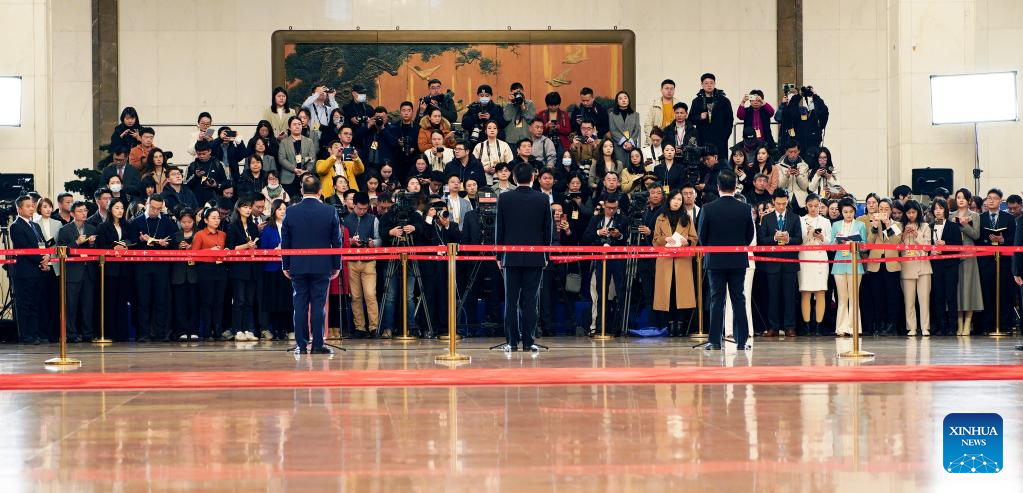 Members of the 14th National Committee of the Chinese People's Political Consultative Conference (CPPCC) are interviewed ahead of the opening of the second session of the 14th CPPCC National Committee at the Great Hall of the People in Beijing, capital of China, March 4, 2024. (Xinhua/Wang Jianhua)