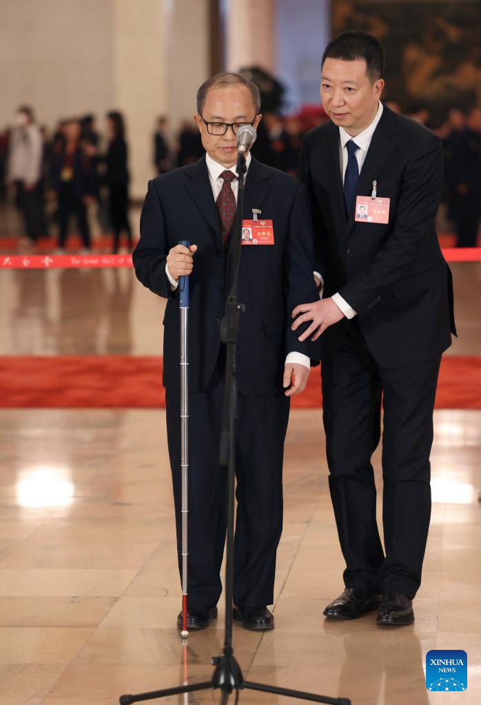 Li Qingzhong (L), a member of the 14th National Committee of the Chinese People's Political Consultative Conference (CPPCC), prepares to be interviewed with the help of Zheng Hong, also a member of the 14th CPPCC National Committee, ahead of the opening of the second session of the 14th CPPCC National Committee at the Great Hall of the People in Beijing, capital of China, March 4, 2024. (Xinhua/Xing Guangli)