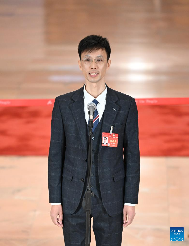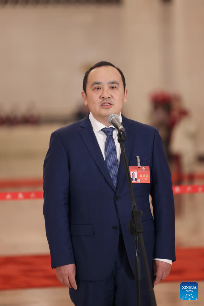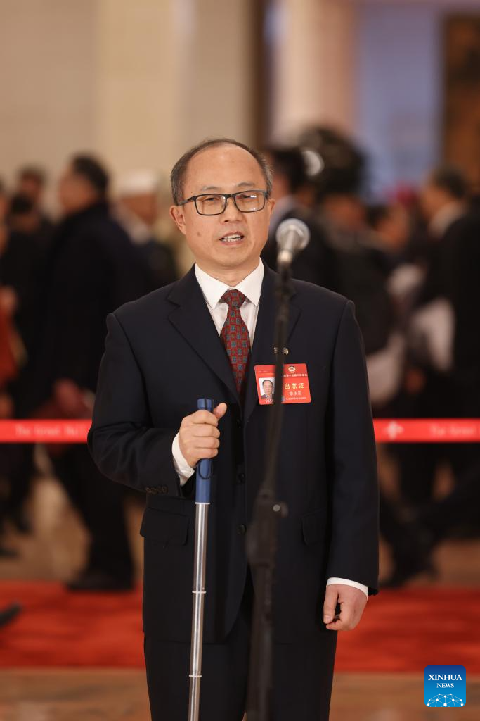 Li Qingzhong, a member of the 14th National Committee of the Chinese People's Political Consultative Conference (CPPCC), is interviewed ahead of the opening of the second session of the 14th CPPCC National Committee at the Great Hall of the People in Beijing, capital of China, March 4, 2024. (Xinhua/Xing Guangli)