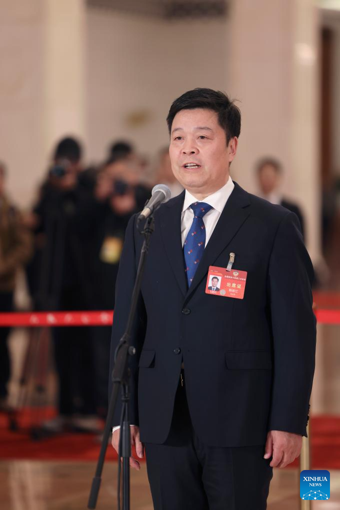 Han Baojiang, a member of the 14th National Committee of the Chinese People's Political Consultative Conference (CPPCC), is interviewed ahead of the opening of the second session of the 14th CPPCC National Committee at the Great Hall of the People in Beijing, capital of China, March 4, 2024. (Xinhua/Xing Guangli)