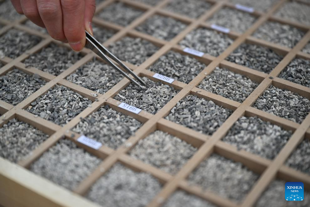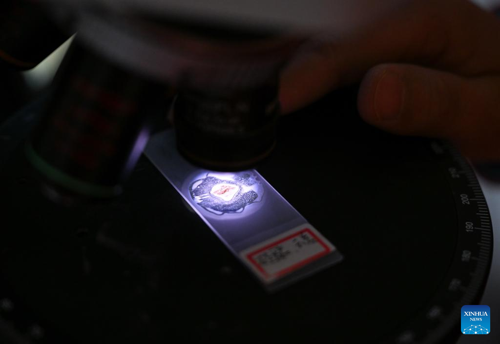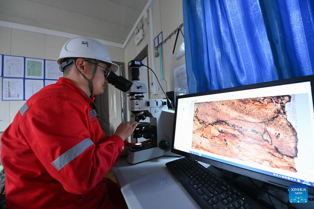 A researcher looks at samples collected from deep earth through a microscope at "Shenditake 1" borehole in the Taklimakan Desert in the Tarim Basin, northwest China's Xinjiang Uygur Autonomous Region, March 3, 2024. (Xinhua/Li Xiang)