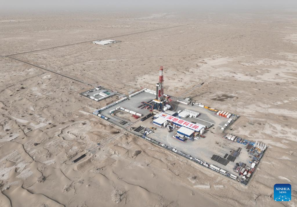 A drone photo taken on March 2, 2024 shows the "Shenditake 1" borehole in the Taklimakan Desert in the Tarim Basin, northwest China's Xinjiang Uygur Autonomous Region. (Xinhua/Li Xiang)