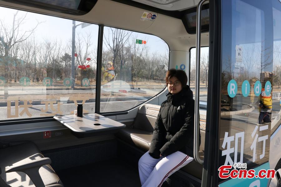 A passenger takes a driverless bus in Tongzhou district, Beijing's sub-center, March 3, 2024. (Photo: China News Service/Yang Kejia)