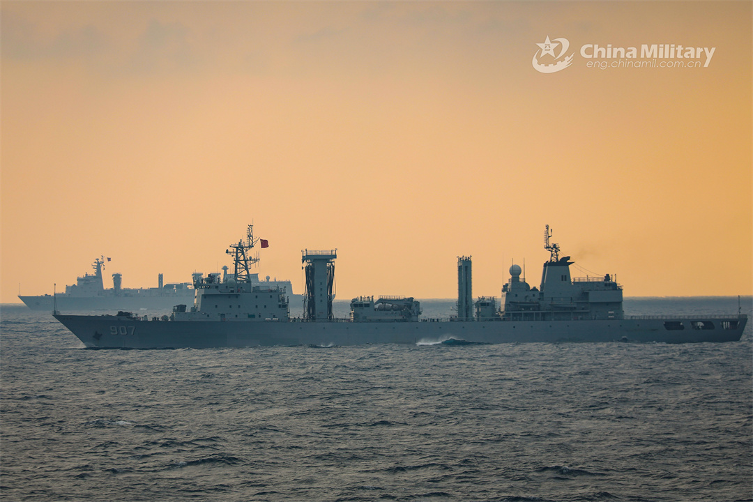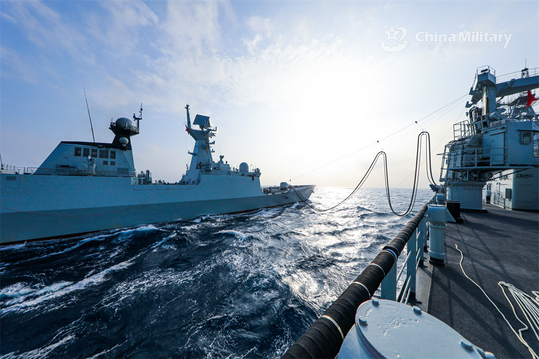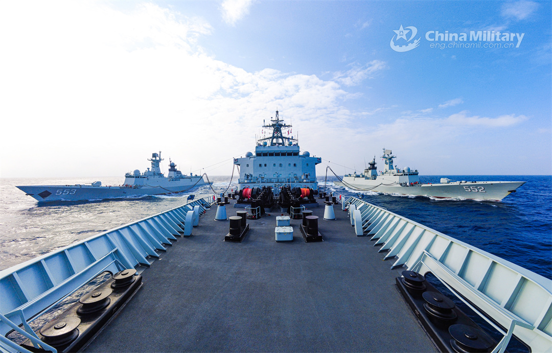 Warships attached to a naval flotilla under the PLA Southern Theater Command perform alongside replenishment at sea during a recent training exercise. (eng.chinamil.com.cn/Photo by Li Junlin)
