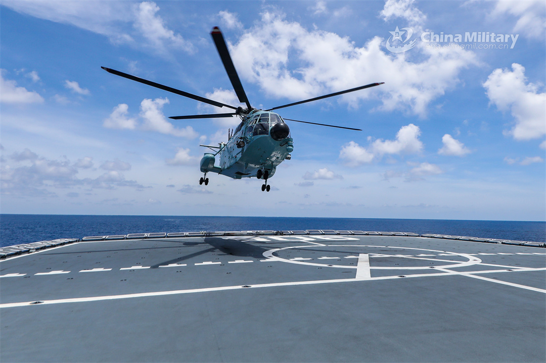A ship-borne helicopter attached to a naval flotilla under the Chinese PLA Southern Theater Command conducts takeoff and landing training during a recent training exercise. (eng.chinamil.com.cn/Photo by Li Junlin)