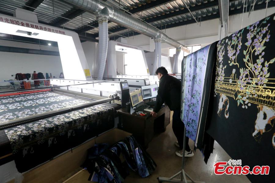 A worker cuts fabric with a laser cutter at a garment factory in Caoxin County, east China's Shandong Province, March 4, 2024. (Photo: China News Service/Liang Ben)