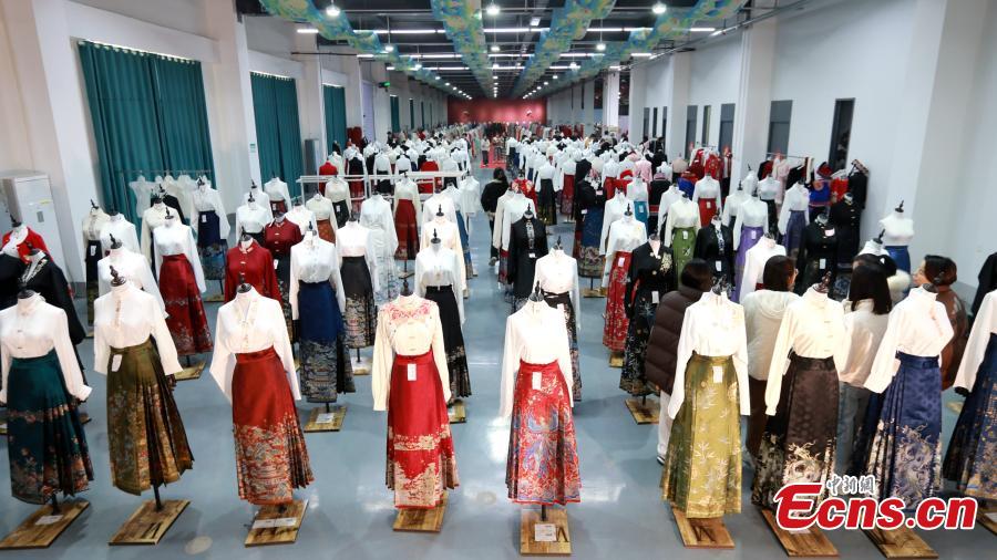 Customers select horse-face skirts at a garment factory in Caoxian County, east China's Shandong Province, March 4, 2024. (Photo: China News Service/Liang Ben)