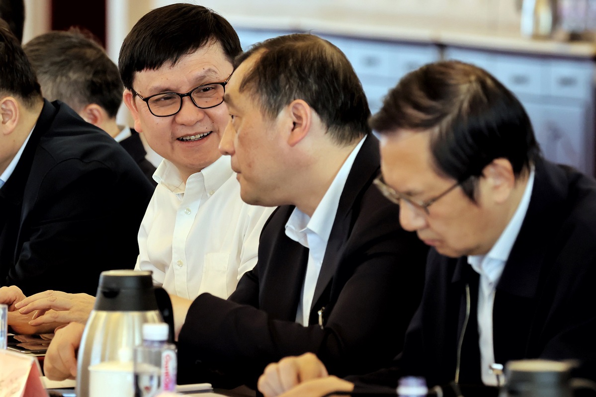 Ding Guanghong, center, a member of the 14th National Committee of the Chinese People's Political Consultative Conference, speaks at a panel discussion on the Government Work Report on March 6, 2024. [Photo by Jiang Dong/chinadaily.com.cn]