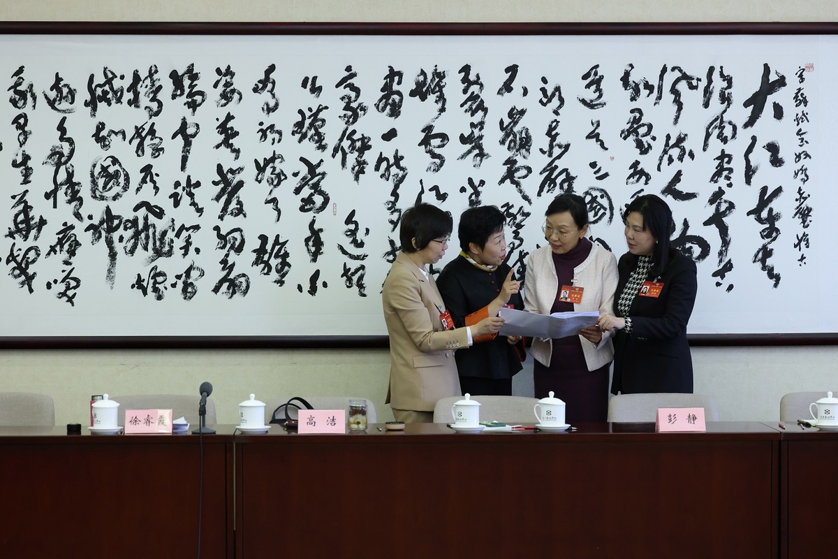 Female political advisers discuss the Government Work Report after a panel discussion on March 6, 2024. [Photo by Wang Jing/chinadaily.com.cn]