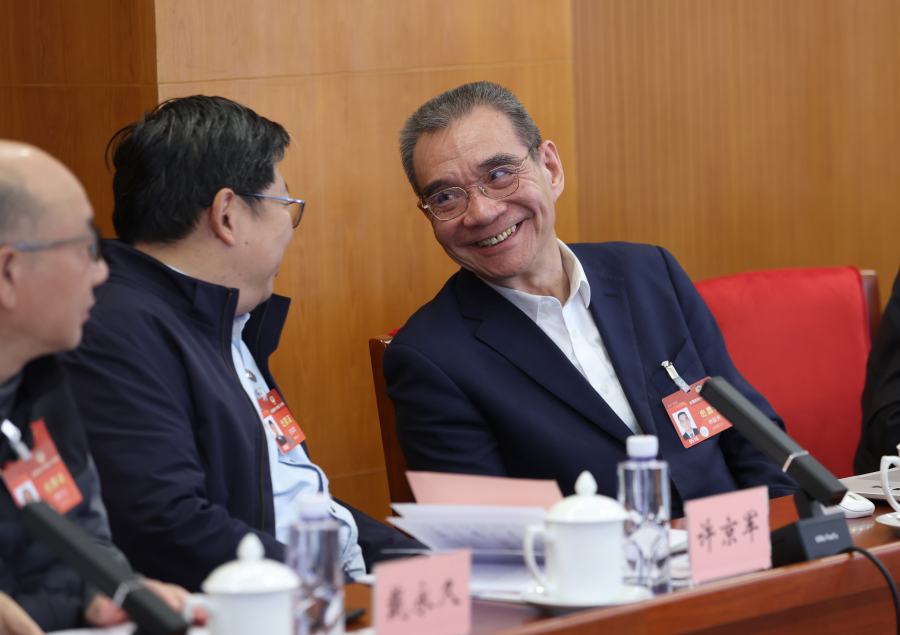 Justin Yifu Lin, right, a member of the Standing Committee of the 14th National Committee of the Chinese People's Political Consultative Conference (CPPCC), vice-chairman of the Committee on Economic Affairs of the CPPCC National Committee and dean of Peking University's Institute of New Structural Economics, attends a panel discussion on the Government Work Report on March 6, 2024. [Photo by Zou Hong/chinadaily.com.cn]