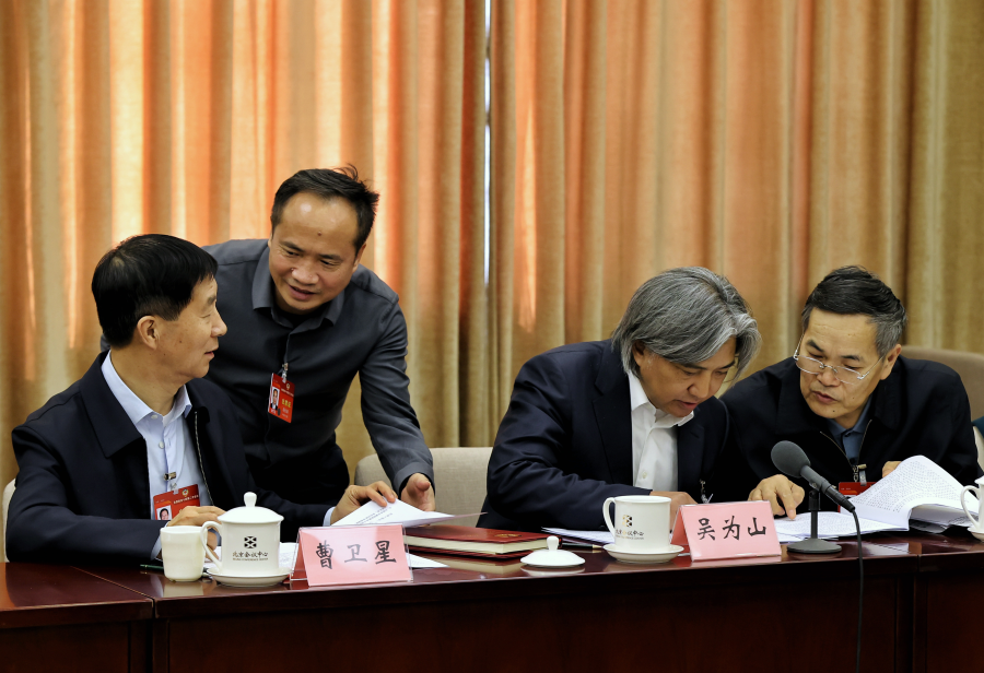 Members of the 14th National Committee of the Chinese People's Political Consultative Conference, Cao Weixing, Deng Changqiu, Wu Weishan and Qian Keming (left to right) talk with each other at a panel discussion on the Government Work Report on March 6, 2024. [Photo by Jiang Dong/chinadaily.com.cn]