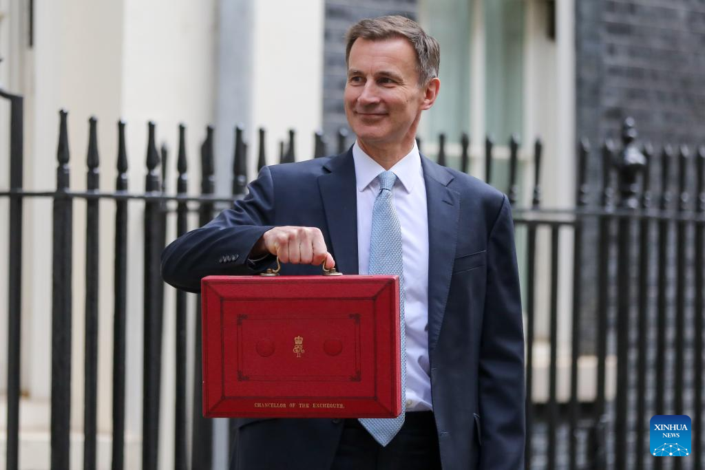 The United Kingdom's (UK) Chancellor of the Exchequer Jeremy Hunt poses for photographs as he leaves 11 Downing Street to deliver his budget to Parliament in London, Britain, on March 6, 2024. The United Kingdom's (UK) Chancellor of the Exchequer Jeremy Hunt on Wednesday announced in his spring budget that National Insurance contributions would be cut for 27 million British workers. (Xinhua)