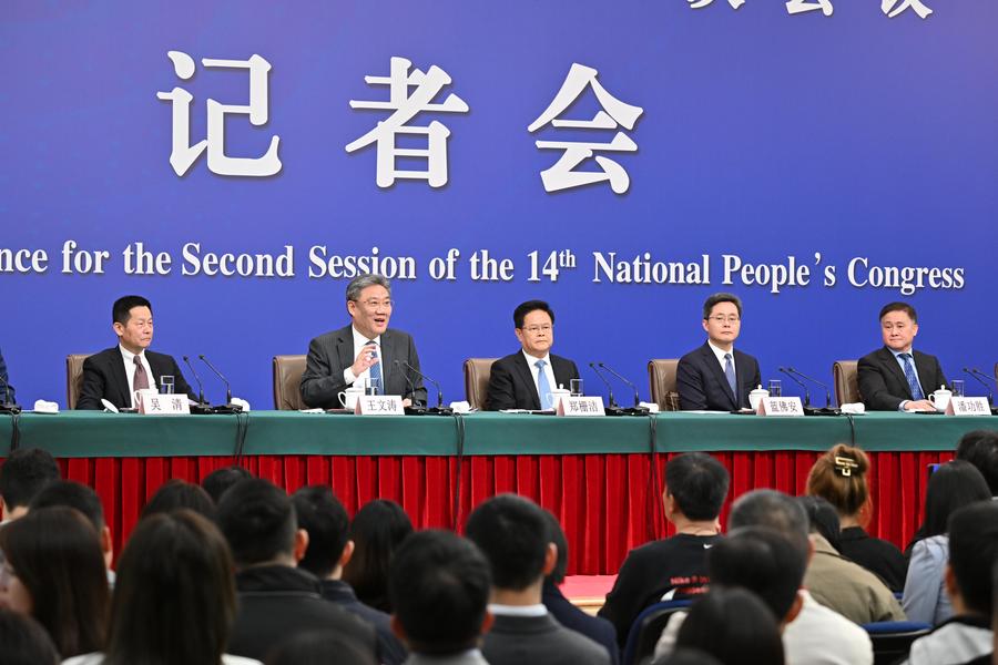 Wang Wentao, minister of commerce, speaks at a press conference on economy for the second session of the 14th National People's Congress (NPC) in Beijing, capital of China, March 6, 2024. Zheng Shanjie, director of the National Development and Reform Commission, Lan Fo'an, minister of finance, Pan Gongsheng, governor of the People's Bank of China, and Wu Qing, chairman of the China Securities Regulatory Commission, also attended the press conference on Wednesday. (Xinhua/Li Xin)