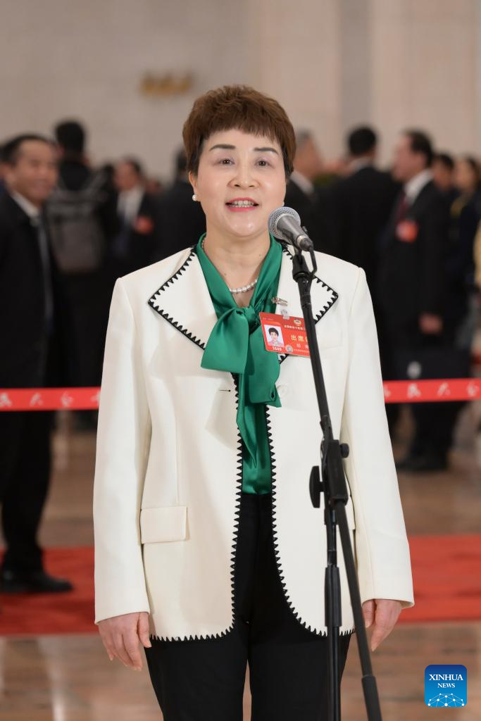 Mei Yu, a member of the 14th National Committee of the Chinese People's Political Consultative Conference (CPPCC), is interviewed ahead of the second plenary meeting of the second session of the 14th CPPCC National Committee at the Great Hall of the People in Beijing, capital of China, March 7, 2024. (Xinhua/Li He)