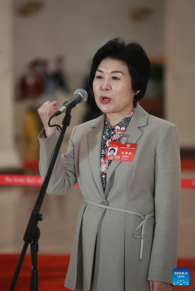 Zhang Haihua, a member of the 14th National Committee of the Chinese People's Political Consultative Conference (CPPCC), is interviewed ahead of the second plenary meeting of the second session of the 14th CPPCC National Committee at the Great Hall of the People in Beijing, capital of China, March 7, 2024. (Xinhua/Lu Ye)