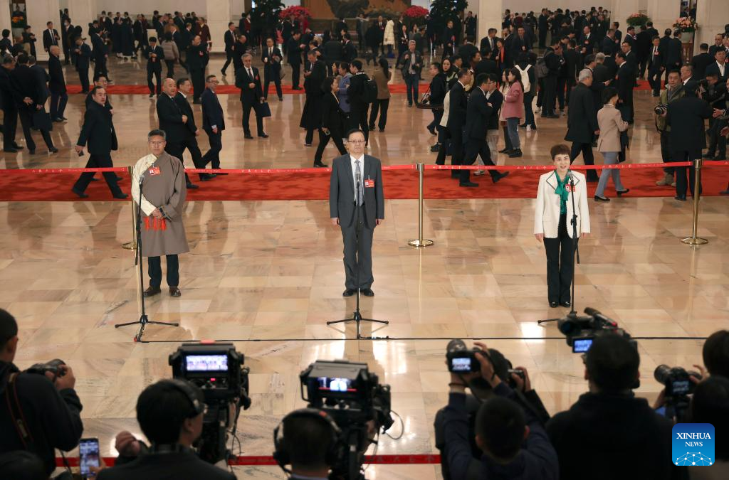 Members of the 14th National Committee of the Chinese People's Political Consultative Conference (CPPCC) are interviewed ahead of the second plenary meeting of the second session of the 14th CPPCC National Committee at the Great Hall of the People in Beijing, capital of China, March 7, 2024. (Xinhua/Xing Guangli)