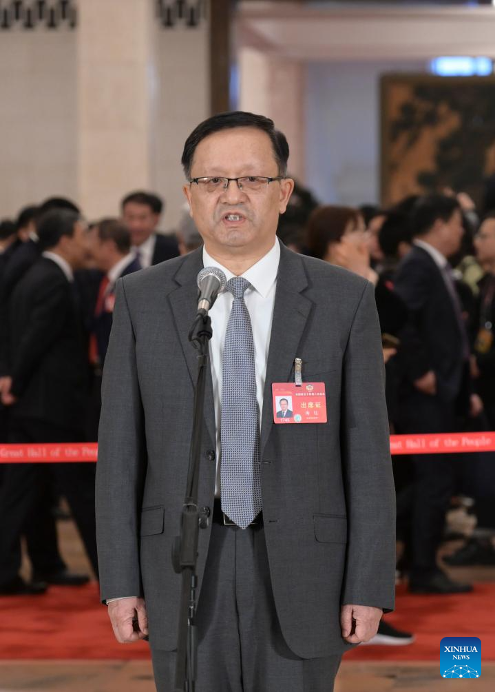 Tang Xudong, a member of the 14th National Committee of the Chinese People's Political Consultative Conference (CPPCC), is interviewed ahead of the second plenary meeting of the second session of the 14th CPPCC National Committee at the Great Hall of the People in Beijing, capital of China, March 7, 2024. (Xinhua/Li He)