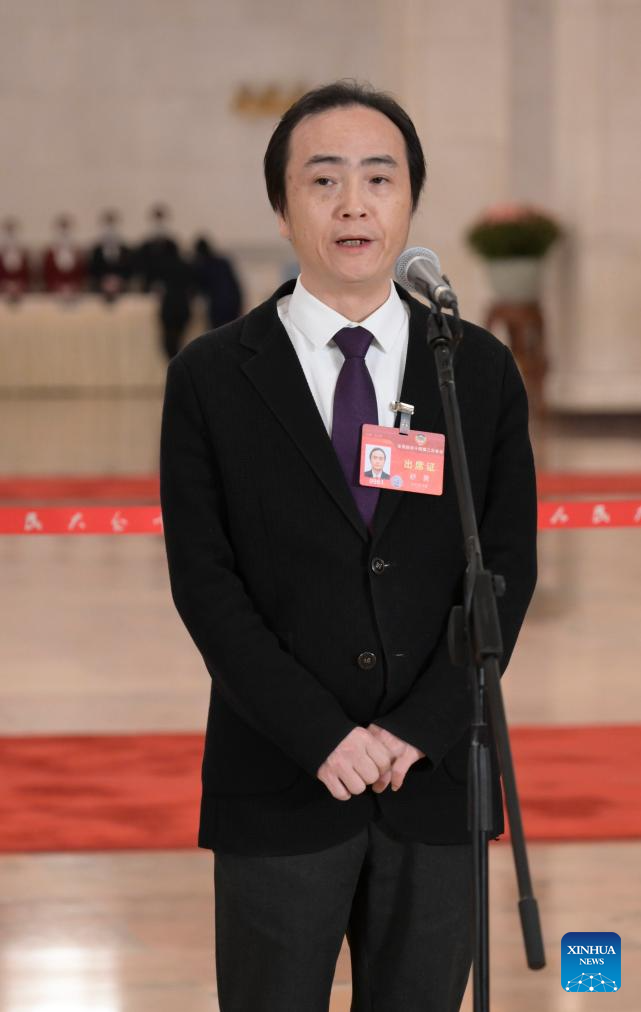 Zheng Jun, a member of the 14th National Committee of the Chinese People's Political Consultative Conference (CPPCC), is interviewed ahead of the second plenary meeting of the second session of the 14th CPPCC National Committee at the Great Hall of the People in Beijing, capital of China, March 7, 2024. (Xinhua/Li He)
