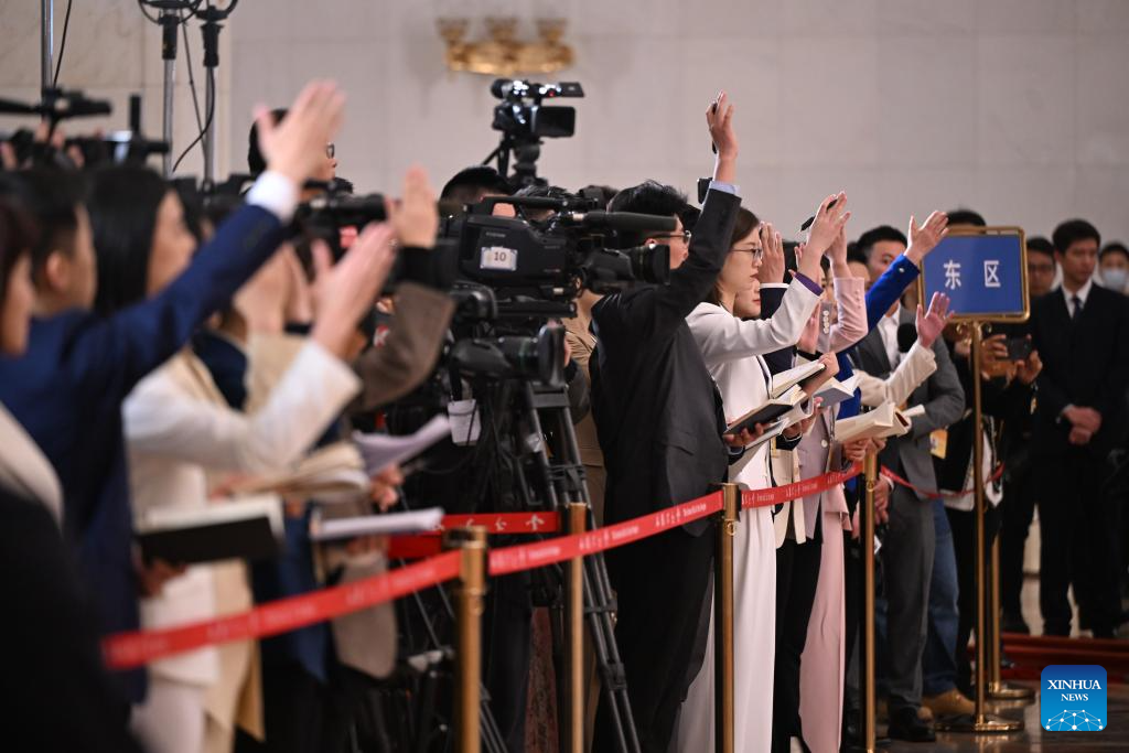 Journalists raise hands to ask questions during an interview attended by members of the 14th National Committee of the Chinese People's Political Consultative Conference (CPPCC) ahead of the second plenary meeting of the second session of the 14th CPPCC National Committee at the Great Hall of the People in Beijing, capital of China, March 7, 2024. (Xinhua/Chen Yehua)