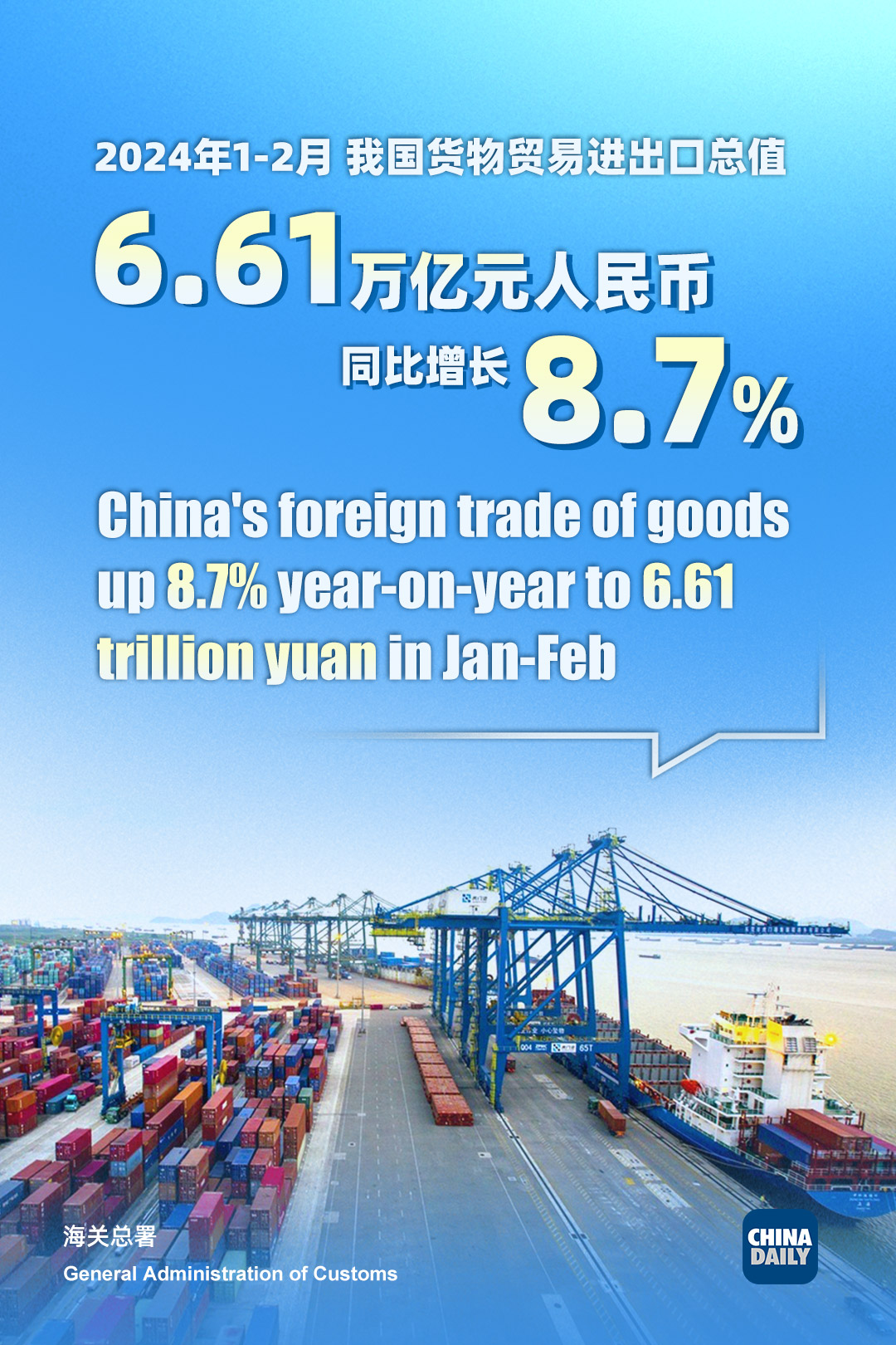 China's foreign trade expanded 8.7 percent year-on-year to 6.61 trillion yuan ($847.4 billion) in the first two months of 2024, official data showed on Thursday.