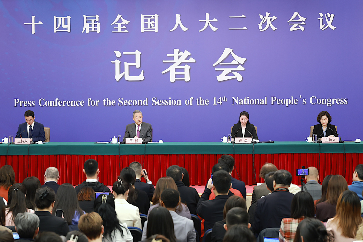 Foreign Minister Wang Yi, also member of the Political Bureau of the Communist Party of China Central Committee, answers questions about the country's foreign policy and diplomatic relations at a press conference on Thursday during the the second session of the 14th National People's Congress, China's top legislature.