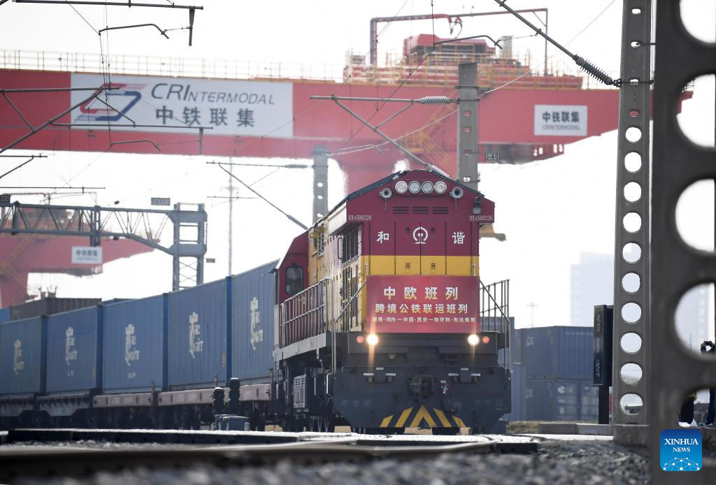 A China-Europe freight train departs from Xi'an international port station in Xi'an, northwest China's Shaanxi Province, March 7, 2024. Since the beginning of 2024, more than 700 trains have been handled under the China-Europe freight train (Xi'an) service. (Xinhua/Li Yibo)