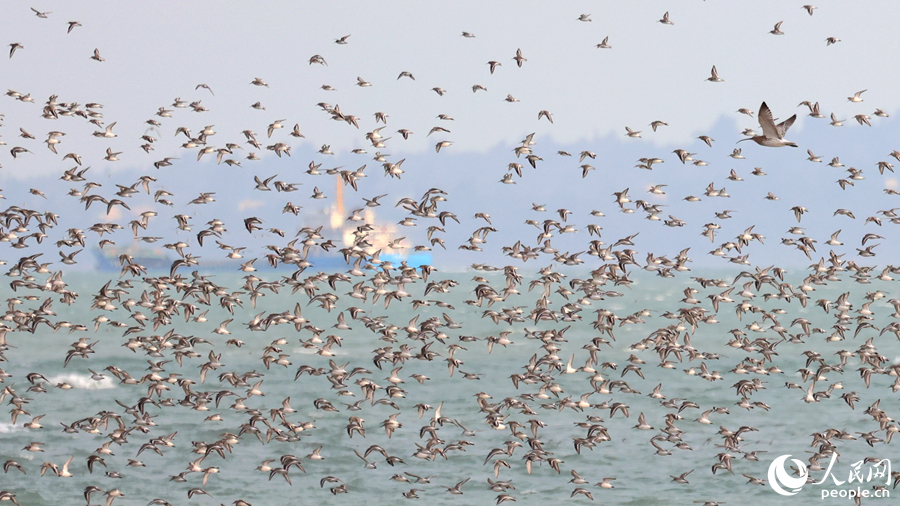 Flocks of birds are seen around the sea in Xiamen city, southeast China's Fujian Province. (People's Daily Online/Chen Bo)