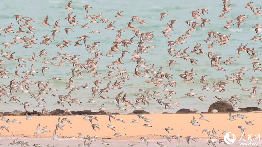Flocks of birds hover above the sandbars located offshore in Xiamen city, southeast China's Fujian Province. (People's Daily Online/Chen Bo)