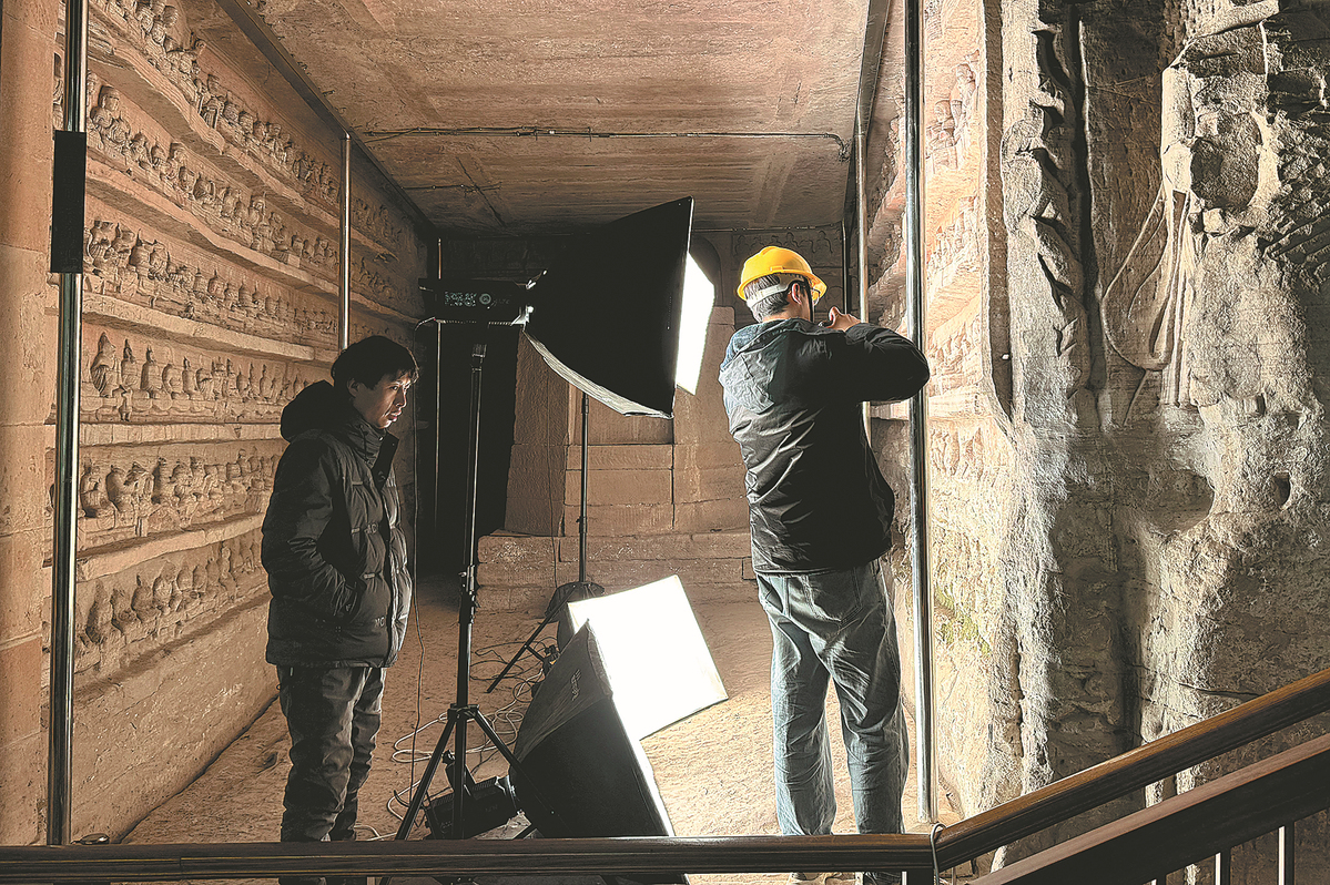 Archaeologists preserve and restore sculptures at the Dazu Rock Carvings in Chongqing in January. DU LIANYI/CHINA DAILY