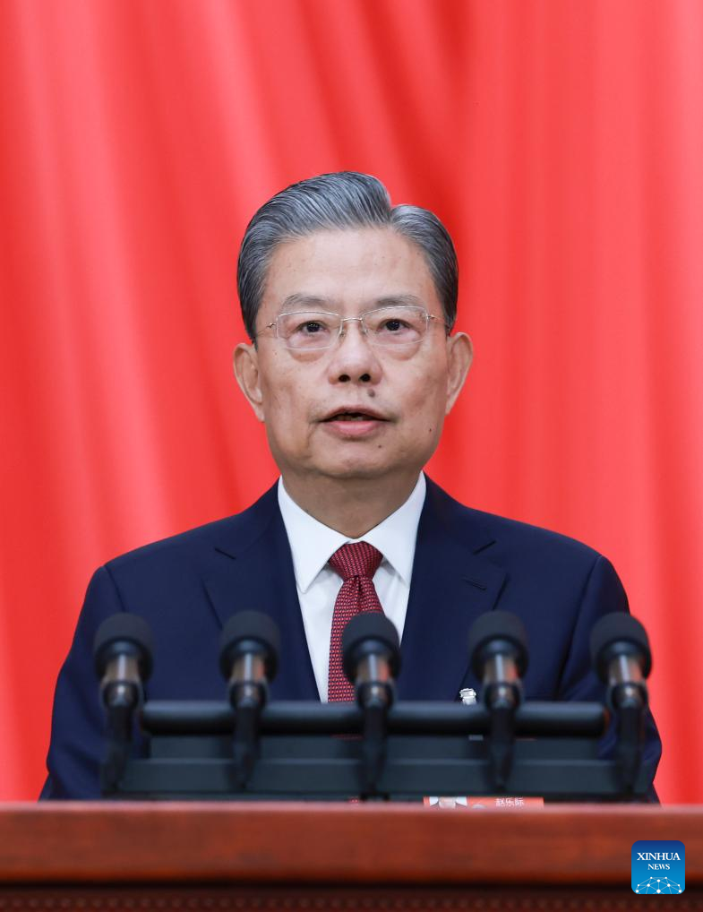 Zhao Leji, chairman of the National People's Congress (NPC) Standing Committee, delivers a work report of the NPC Standing Committee at the second plenary meeting of the second session of the 14th NPC at the Great Hall of the People in Beijing, capital of China, March 8, 2024. (Xinhua/Wang Ye)