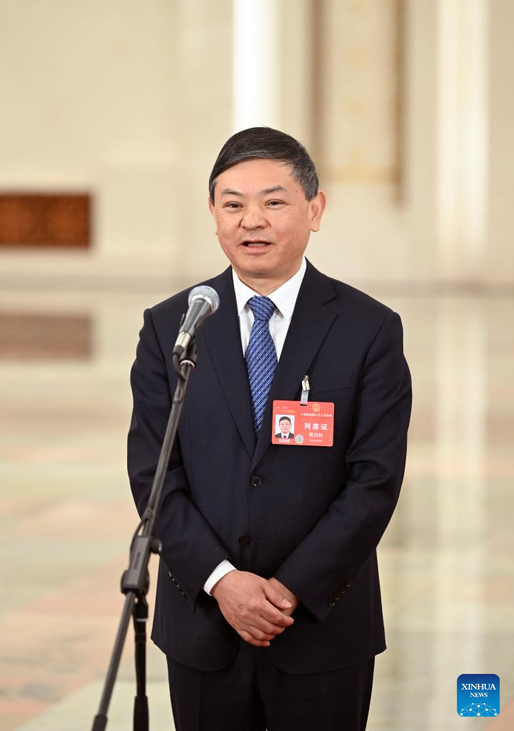 Chinese Minister of Ecology and Environment Huang Runqiu gives an interview after the second plenary meeting of the second session of the 14th National People's Congress (NPC) at the Great Hall of the People in Beijing, capital of China, March 8, 2024. (Xinhua/Li Xin)