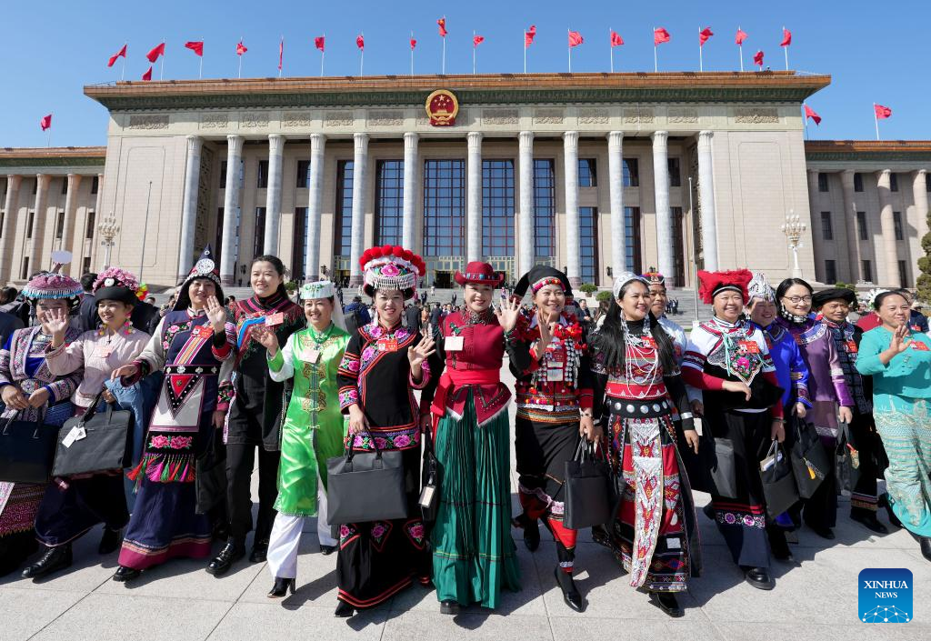 Deputies to the 14th National People's Congress (NPC) pose for photos before attending the second plenary meeting of the second session of the 14th NPC in Beijing, capital of China, March 8, 2024. (Xinhua/Cai Yang)