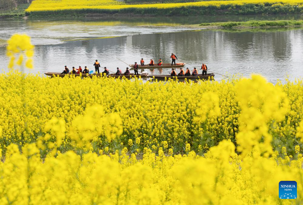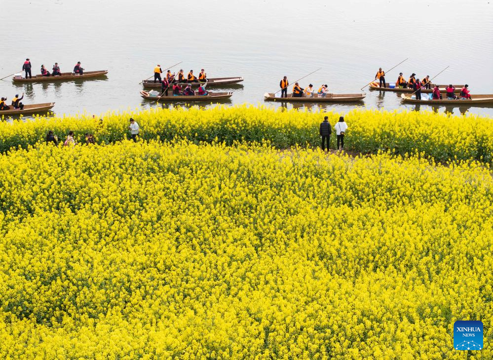 An aerial drone photo taken on March 7, 2024 shows tourists on boats enjoying the view of rapeseed flowers in Lianghe Village, Qionglai City, Chengdu, southwest China's Sichuan Province. (Xinhua/Jiang Hongjing)