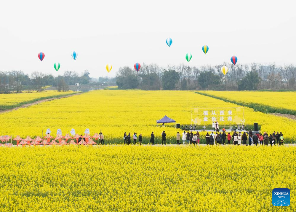 Tourists enjoy the view of rapeseed flowers in Lianghe Village, Qionglai City, Chengdu, southwest China's Sichuan Province, March 7, 2024. (Xinhua/Jiang Hongjing)