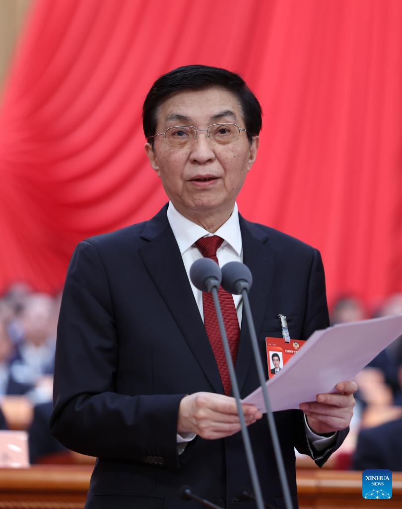 Wang Huning, chairman of the Chinese People's Political Consultative Conference (CPPCC) National Committee, presides over the closing meeting of the second session of the 14th CPPCC National Committee at the Great Hall of the People in Beijing, capital of China, March 10, 2024. Wang delivered a speech at the meeting on Sunday. (Xinhua/Ju Peng)