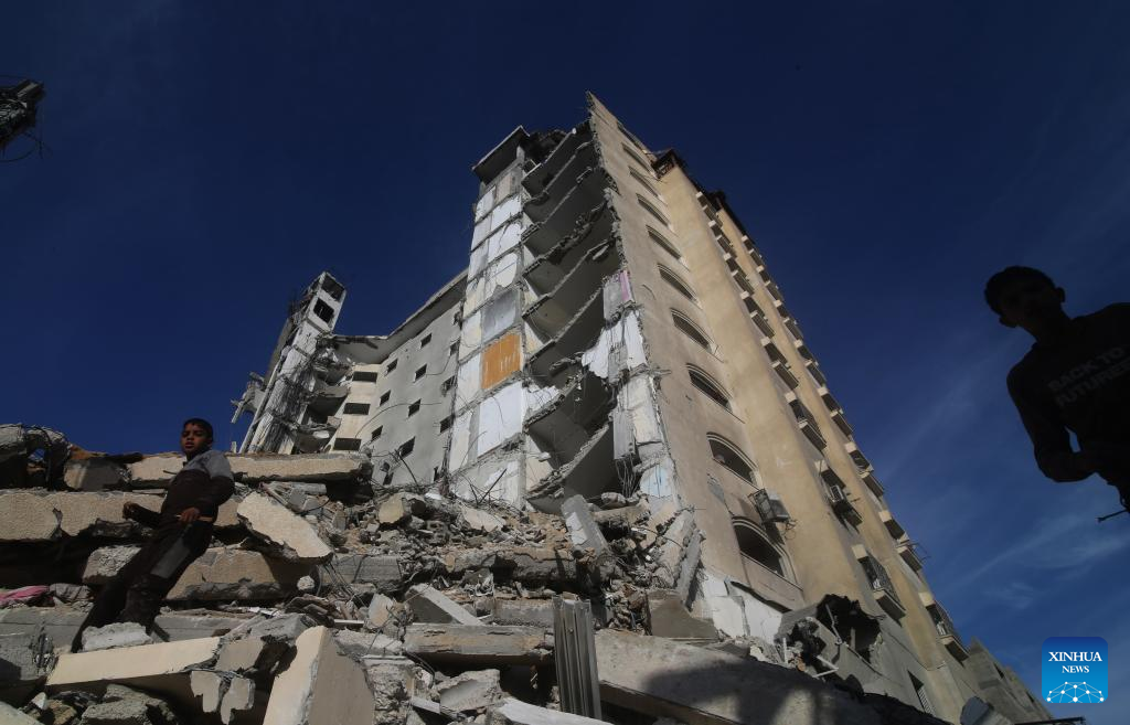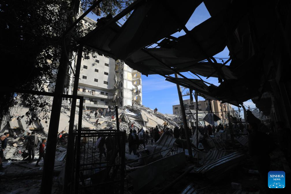 People inspect destroyed buildings after intense airstrikes in the southern Gaza Strip city of Rafah, on March 9, 2024. The Palestinian death toll from ongoing Israeli attacks on the Gaza Strip has risen to 30,960 with 72,524 others wounded, the Hamas-run Health Ministry said in a press statement on Saturday. (Photo by Yasser Qudih/Xinhua)