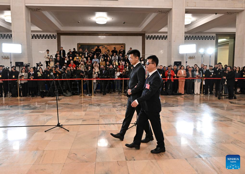 Wang Yongcheng (R, front), a deputy to the 14th National People's Congress (NPC), prepares to give an interview ahead of the second plenary meeting of the second session of the 14th NPC at the Great Hall of the People in Beijing, capital of China, March 8, 2024. (Xinhua/Cai Yang)