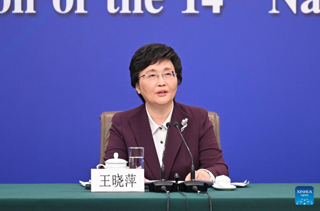 China's Minister of Human Resources and Social Security Wang Xiaoping speaks at a press conference on people's livelihood for the second session of the 14th National People's Congress (NPC) in Beijing, capital of China, March 9, 2024. China's Minister of Education Huai Jinpeng, Minister of Housing and Urban-Rural Development Ni Hong, and Chief of the National Disease Control and Prevention Administration Wang Hesheng also attended the press conference on Saturday. (Xinhua/Mu Yu)