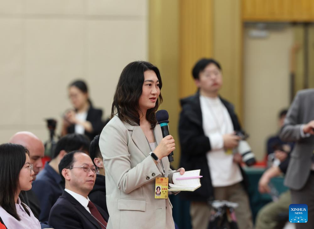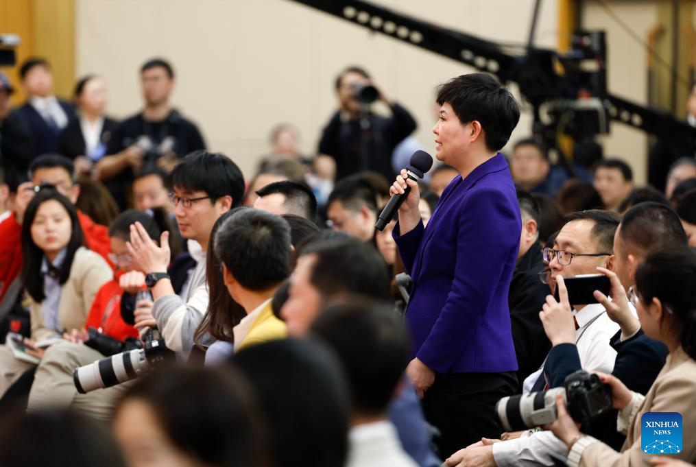A journalist asks a question at a press conference on people's livelihood for the second session of the 14th National People's Congress (NPC) in Beijing, capital of China, March 9, 2024. China's Minister of Education Huai Jinpeng, Minister of Human Resources and Social Security Wang Xiaoping, Minister of Housing and Urban-Rural Development Ni Hong, and Chief of the National Disease Control and Prevention Administration Wang Hesheng attended the press conference on Saturday. (Xinhua/Fei Maohua)