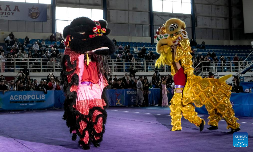 Artists perform lion dance during the opening ceremony of the Acropolis-Forbidden City International Wushu Tournament in Athens, Greece, on March 9, 2024. (Photo by Panagiotis Moschandreou/Xinhua)