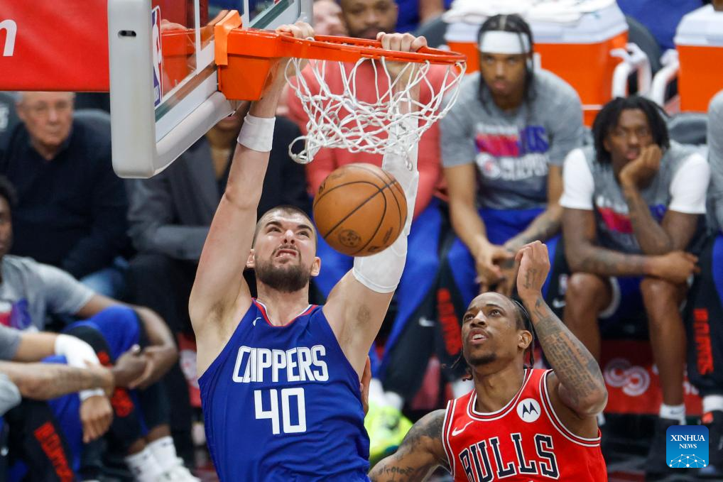 Los Angeles Clippers' Ivica Zubac (L) dunks during the 2023-2024 NBA regular season match between Los Angeles Clippers and Chicago Bulls in Los Angeles, the United States, March 9, 2024. (Photo by Ringo Chiu/Xinhua)