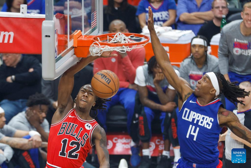 Chicago Bulls' Ayo Dosunmu (L) dunks during the 2023-2024 NBA regular season match between Los Angeles Clippers and Chicago Bulls in Los Angeles, the United States, March 9, 2024. (Photo by Ringo Chiu/Xinhua)