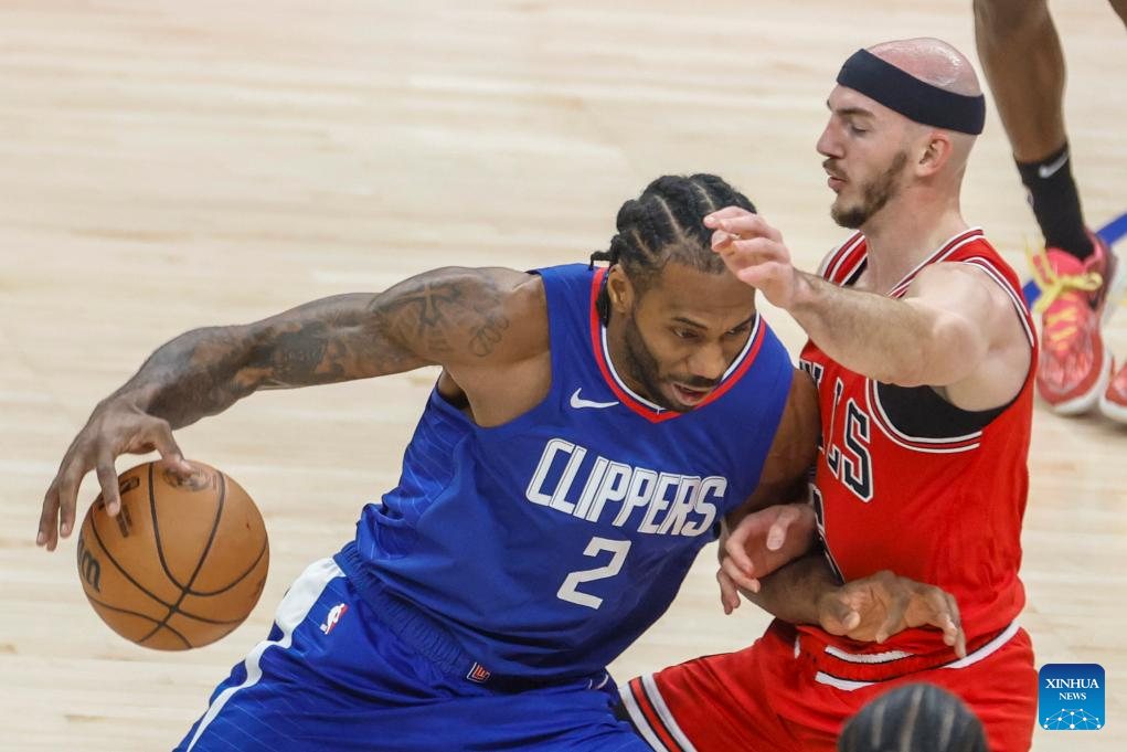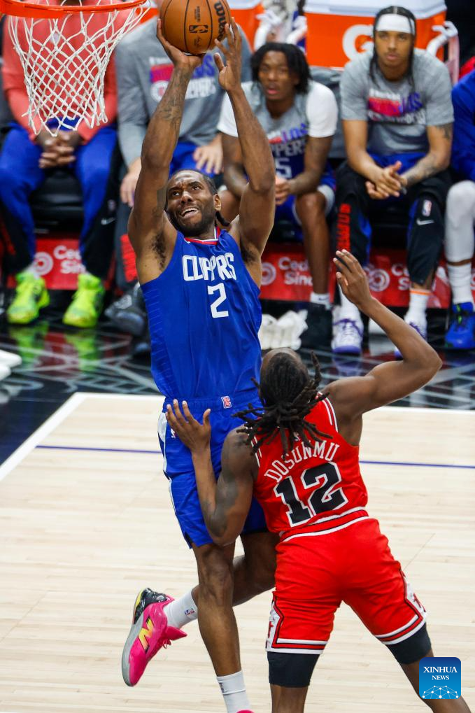Los Angeles Clippers' Kawhi Leonard (top) goes to the basket during the 2023-2024 NBA regular season match between Los Angeles Clippers and Chicago Bulls in Los Angeles, the United States, March 9, 2024. (Photo by Ringo Chiu/Xinhua)