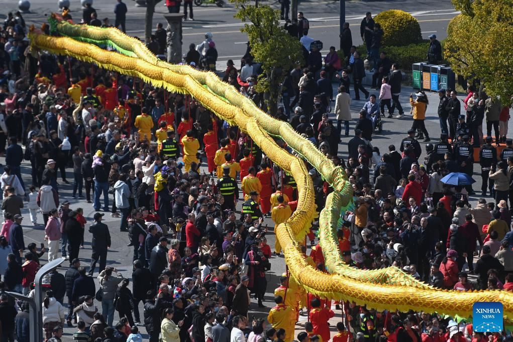Folk artists perform dragon dance in celebration of the upcoming Longtaitou Day in Fenghua, east China's Zhejiang Province, March 10, 2024. (Xinhua/Huang Zongzhi)