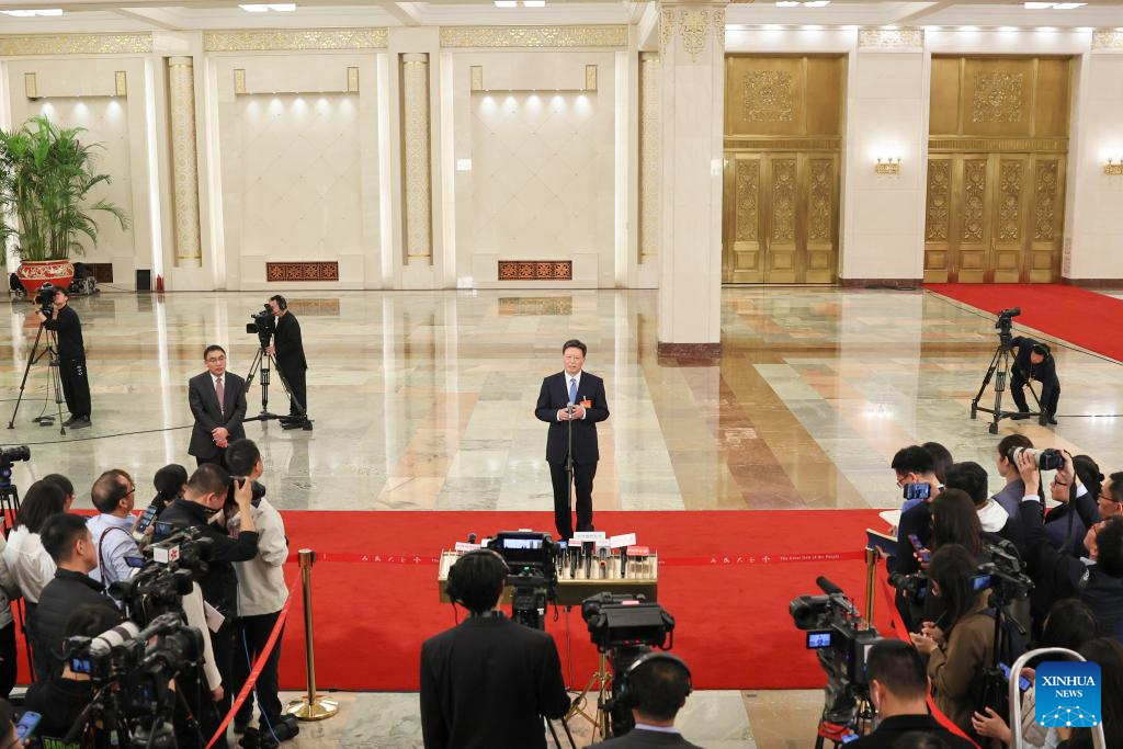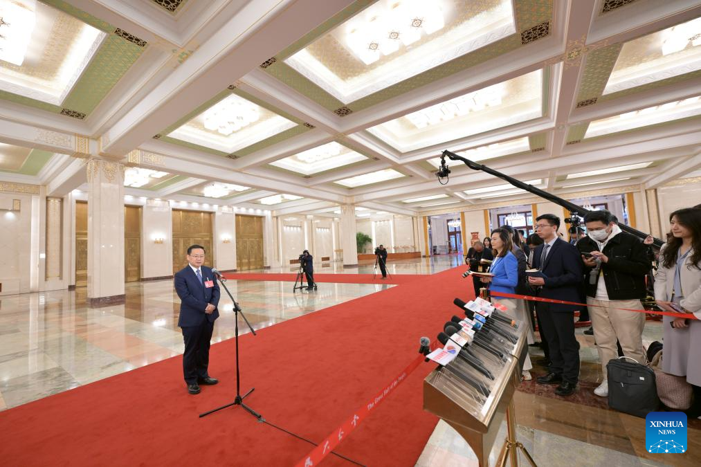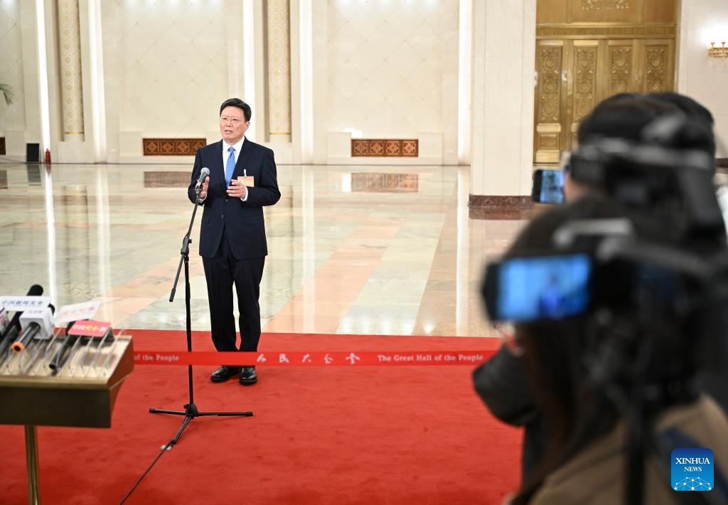 Yu Jianhua, head of the General Administration of Customs (GAC) of China, gives an interview after the closing meeting of the second session of the 14th National People's Congress (NPC) at the Great Hall of the People in Beijing, capital of China, March 11, 2024. (Xinhua/Liu Xu)